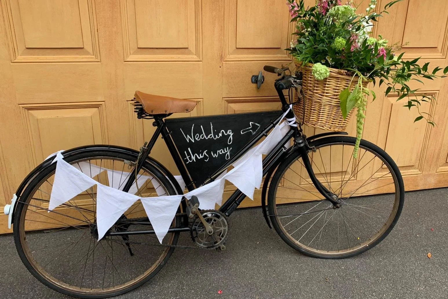 This vintage bicycle comes with a chalkboard and basket, each of which can be removed to suit your needs. It looks amazing as a welcome sign and photo prop at any event or wedding.